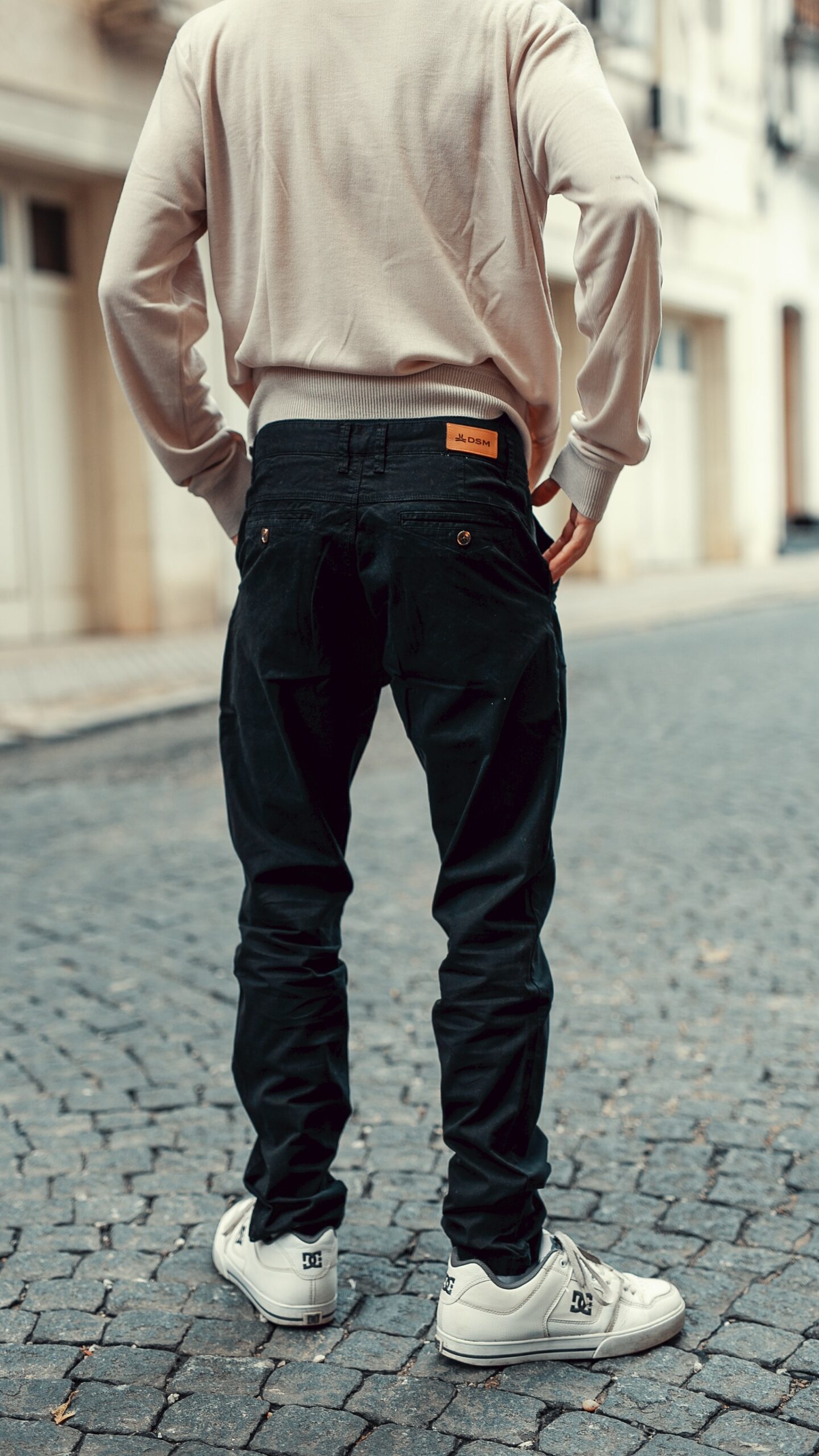 Su corte slim logra un calce moderno y favorecedor, mientras que su terminación limpia lo convierte en una prenda fácil de combinar.